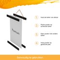 Grâce aux aimants incrustés, vous pouvez facilement accrocher votre affiche. Vous placez l'affiche sur une latte avec des aimants placés vers le haut. Ici, vous mettez l'affiche que vous attachez avec l'autre latte. Cela maintient l'affiche toujours en place.