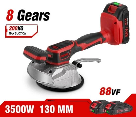 Porte-carreaux électrique 200 kg – Puissance 3 500 W – 2 batteries – 8 vitesses – Vibrations 72 000 tr/min – Poignée ergonomique – Longue durée de vie de la batterie – Rapide et précis – Pose de carrelage sans effort