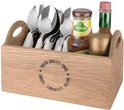 Support en Chêne pour sauces, épices, serviettes et couverts. Avec l'empreinte : 'Fresh Quality Food. Sauces, Condiments, Relish'.