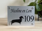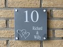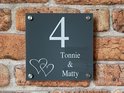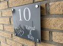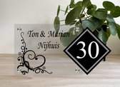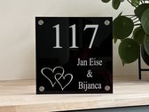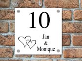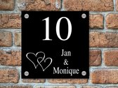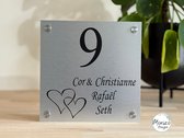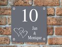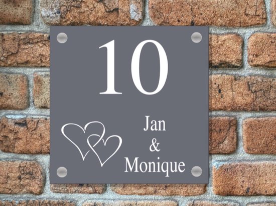 Il s'agit d'une plaque signalétique élégante avec 2 coeurs dessus. L'impression blanche est réalisée sur une plaque en plexiglas anthracite mesurant 20x20 cm.