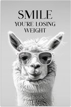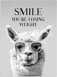 Un lama avec des lunettes avec la citation «Smile , vous perdez du poids » sur fond gris.