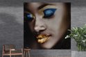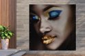 Un gros plan d'une femme avec un fard à paupières bleu et un rouge à lèvres doré.