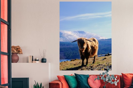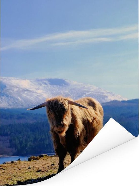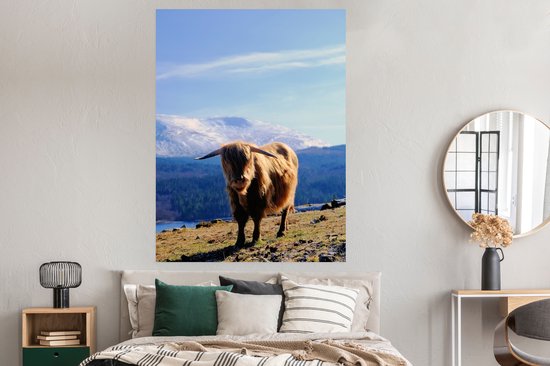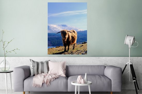 Poster Highlander écossais avec vue montagneuse 120x160 cm - Tirage photo sur Poster (décoration murale salon / chambre) / Poster Animaux sauvages XXL / Groot format!