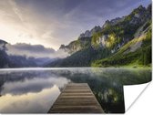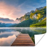 Une image sereine d'un paysage en Autriche avec une jetée traversant l'eau claire au premier plan. Le coucher de soleil crée une lueur chaude sur les montagnes qui se reflète dans l'eau. Cette image convient au salon.