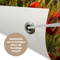 Les Posters de jardin, également appelées toiles de jardin, sont des affiches spécialement conçues pour être accrochées à l'extérieur. Cette nappe de jardin peut donc prendre une raclée. La voile Bisonyl a été utilisée pour cette affiche extérieure. Cette voile est une bâche enduite avec une belle finition. L'affiche de jardin est résistante aux UV, elle ne se décolore donc pas au soleil. Plusieurs anneaux ont été placés dans la toile pour que vous puissiez facilement l'accrocher! Jusqu'à une taille de 120x80 cm, les anneaux sont dans les coins, avec des tailles plus grandes, les anneaux viennent tous les 60 cm. Le tissu peut résister aux différentes conditions météorologiques et durera au moins 3 ans.
