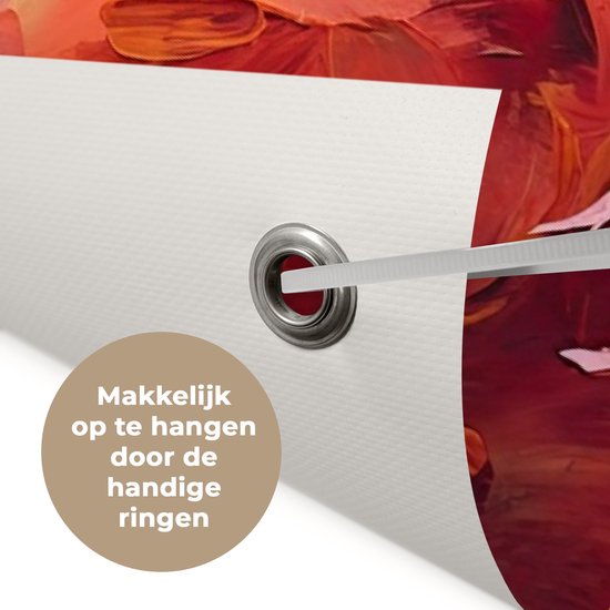 Les Posters de jardin, également appelées toiles de jardin, sont des affiches spécialement conçues pour être accrochées à l'extérieur. Cette nappe de jardin peut donc prendre une raclée. La voile Bisonyl a été utilisée pour cette affiche extérieure. Cette voile est une bâche enduite avec une belle finition. L'affiche de jardin est résistante aux UV, elle ne se décolore donc pas au soleil. Plusieurs anneaux ont été placés dans la toile pour que vous puissiez facilement l'accrocher! Jusqu'à une taille de 120x80 cm, les anneaux sont dans les coins, avec des tailles plus grandes, les anneaux viennent tous les 60 cm. Le tissu résiste aux différentes influences climatiques et est garanti 3 ans.