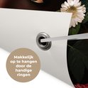Les Posters de jardin, également appelées toiles de jardin, sont des affiches spécialement conçues pour être accrochées à l'extérieur. Cette nappe de jardin peut donc prendre une raclée. La voile Bisonyl a été utilisée pour cette affiche extérieure. Cette voile est une bâche enduite avec une belle finition. L'affiche de jardin est résistante aux UV, elle ne se décolore donc pas au soleil. Plusieurs anneaux ont été placés dans la toile pour que vous puissiez facilement l'accrocher! Jusqu'à une taille de 120x80 cm, les anneaux sont dans les coins, avec des tailles plus grandes, les anneaux viennent tous les 60 cm. Le tissu peut résister aux différentes conditions météorologiques et durera au moins 3 ans.