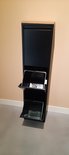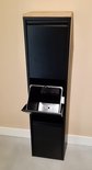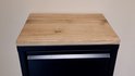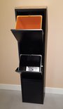Cette poubelle élégante dispose de 3 seaux intérieurs de 16L chacun. Le panneau en chêne massif sur le dessus donne à la poubelle noire mate une belle apparence ; conception. Le panneau en chêne a un biseau (côté biseauté) et fini avec une laque invisible, qui protège le bois.