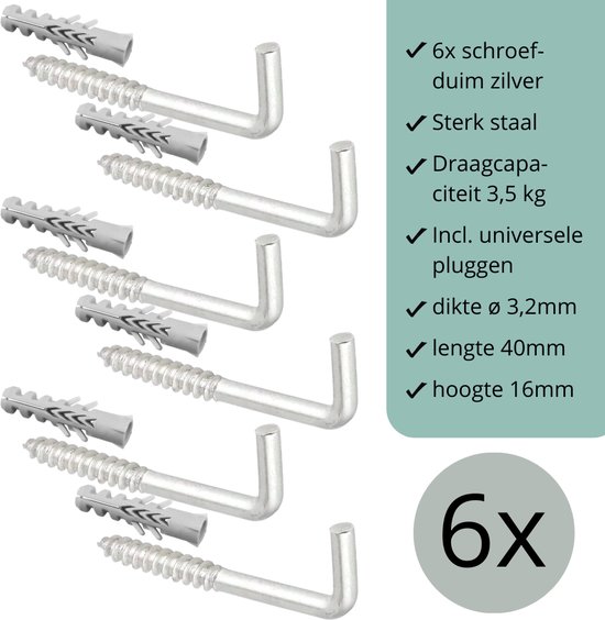 Pouces à vis Argent - 6 pièces - 40mm x 16mm x ø3,2mm (crochet à vis - pouce à vis - crochet de suspension - crochet mural)