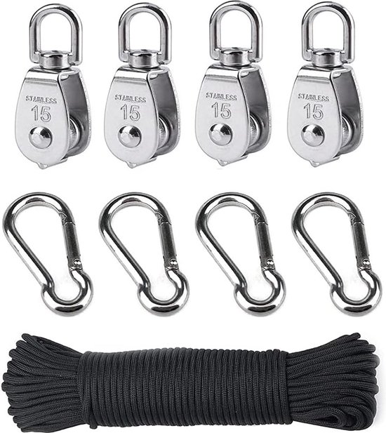 - Combinaison parfaite : comprend : 4 poulies M15, 4 mousquetons, 31 mètres de cordon de traction en nylon de 4 mm. Poulie M15, capacité de charge maximale : 35 kg ; mousqueton à ressort, charge maximale : 200 kg ; Câble de tension de 4 mm x 31 m, tension maximale : 100 kg.