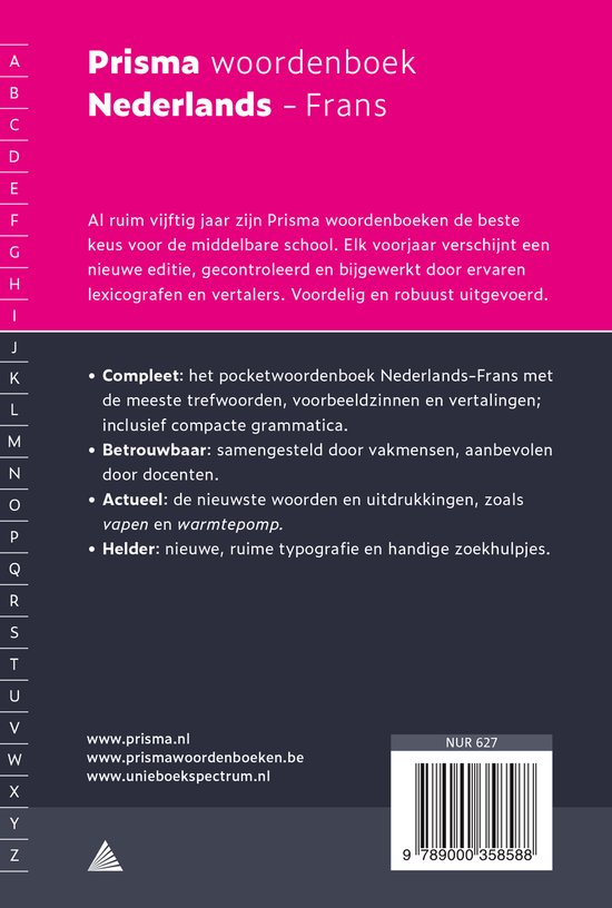 Al ruim 60 jaar stellen ervaren lexicografen de Prisma woordenboeken samen. Ook deze 2024 editie Nederlands-Frans is volledig bijgewerkt met 31.000+ trefwoorden en de nieuwste woorden, waardoor ze betrouwbaar, compleet en actueel zijn. Daarnaast onderscheiden Prisma woordenboeken zich door de slimme navigatie, met letterliniaal en duimgrepen. Zo zijn woorden veel sneller te vinden – ideaal tijdens toetsen en examens.