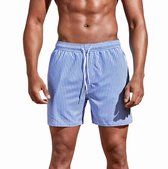 Short de bain rayé Blauw et blanc pour homme. Equipé d'une ceinture élastique avec cordons de serrage et de deux poches latérales. Le short de bain a un slip intérieur et un imprimé flamant rose. Fait en 100 % polyester