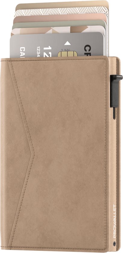 Prowallet Slim – Porte-cartes RFID - Beige – Portefeuille compact pour 8 cartes et billets – Porte-cartes coulissant en aluminium et simili cuir – Coffret cadeau de luxe – Homme & Femme