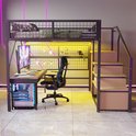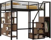 Pugsdrly Lit en fer 140*200 cm Lit mezzanine Convient aux enfants et aux adolescents Structure en métal Design polyvalent Avec échelle de rangement Avec armoire ouverte Bandes lumineuses LED contrôlées par application Zwart