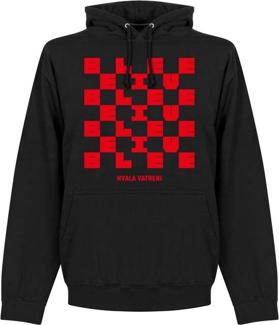 Élégant pull à capuche Croatie de Retake pour adultes. Ce maillot noir a une impression des blocs emblématiques du maillot de football de l'équipe nationale de football de Croatie. Dans ces blocs, le texte: «CROIRE» est incorporé. Sous ces blocs se trouve le texte: `` HVALA VETRENI. '' Sweat à capuche parfait pour le vrai fan de Croatie. Joli à porter en toute décontraction. 100% coton.