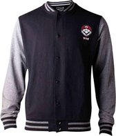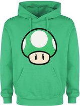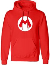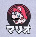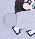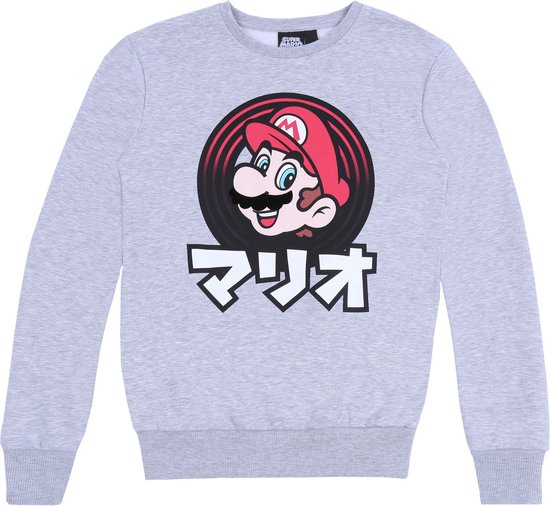 Une image de Super Mario sur le devant. Les manches, le col et le bas du pull sont ornés de bordures.