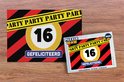 Décoration d'anniversaire avec le chiffre '16' et le texte 'Félicitations' sur fond rayé.