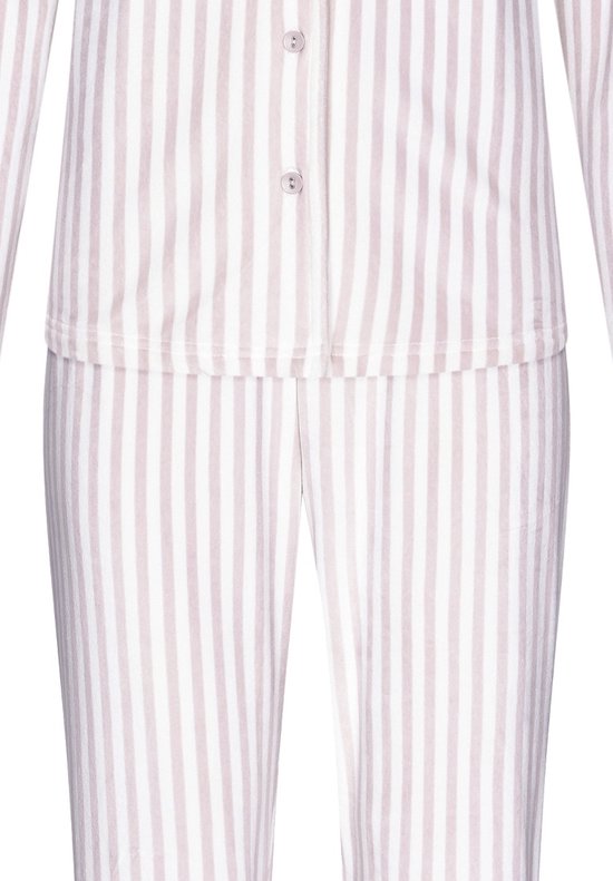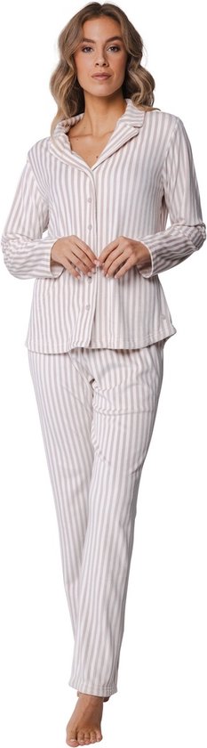 Un pyjama chaud en velours entièrement boutonné de la marque Pastunette. La blouse de pyjama a des manches longues et un col à revers. Le chemisier et le pantalon long présentent un motif à rayures de couleur taupe sur fond blanc. Ce pyjama chaud et doux est fabriqué à partir de matériaux durables. Spécifications produit : Composition tissu : 95% polyester, 5% velours élasthanne (70% recyclé) Merk: Pastunette Saison : Automne/Hiver