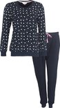 Pyjama Tenderness Terry Femme en 80% coton peigné et 20% polyester . Le haut du pyjama a le tissu éponge à l'intérieur. Le haut avec un motif étoile imprimé a des manches longues avec des poignets, le haut a également un col rond et une planche à l'ourlet. Le pantalon long union a le tissu éponge à l'extérieur, le pantalon a également un cordon de serrage à la taille et des revers aux chevilles. Tous les poignets en élasthanne pour plus de confort.
