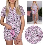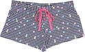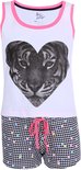 Pyjama femme deux pièces composé d'un tee-shirt bustier blanc et d'un short court à motifs géométriques.