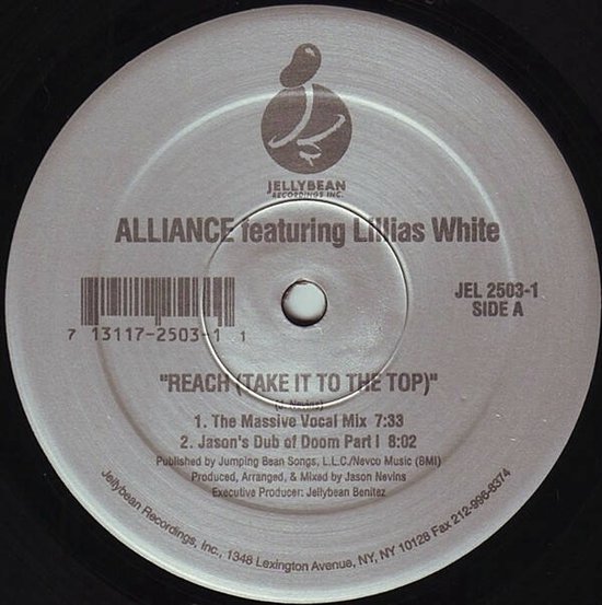 Inscriptions sur l'étiquette : Titre : Reach (Take It To The Top) Artist: Jason Nevins Presents Alliance Featuring Lillias White Genre : Électronique, House Format : 1 x Vinyl 12", 33 ⅓ tours/min Label : Jellybean Recordings Année : 1995 État du disque : Très bon + (VG+) État de la pochette : Generic