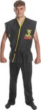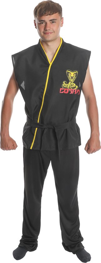 Ce costume d'étudiant en karaté est destiné aux adultes. Il se compose d'un haut, d'un pantalon et d'une ceinture. Le haut est un haut sans manches, noir et ample avec un logo jaune représentant un cobra et l'inscription "cobra" en rouge. Le pantalon et la ceinture sont également noirs. Pour une soirée à thème ou un carnaval, choisissez ce costume d'étudiant en karaté !