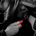 Vous pouvez attacher ResQMe ™ à votre trousseau avec un clip amovible. Retirez le clip du produit pour sortir la lame. Accrochez-le à la ceinture de sécurité et tirez. Pour activer le brise-vitre, appuyez simplement sur la tête noire contre une fenêtre latérale jusqu'à ce que la pointe à ressort cachée se libère et brise la fenêtre.