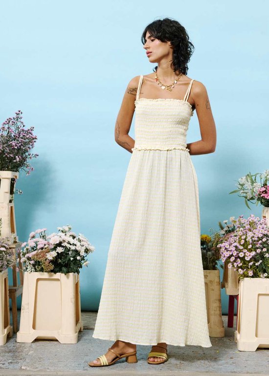 La robe FRNCH Marianne est la pièce estivale par excellence pour un look léger et élégant. Cette longue robe maxi présente un subtil motif à carreaux jaunes et est confectionnée dans un mélange de coton et de lin respirant. Le buste smocké avec de fins plis assure une coupe flatteuse, tandis que les doubles bretelles réglables ajoutent une touche ludique. La texture douce du tissu et la silhouette fluide rendent cette robe parfaite pour les journées chaudes. Portez-le avec des sandales ou des baskets et vous serez prêt pour une journée d'été avec style.