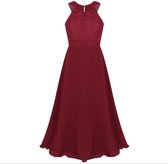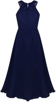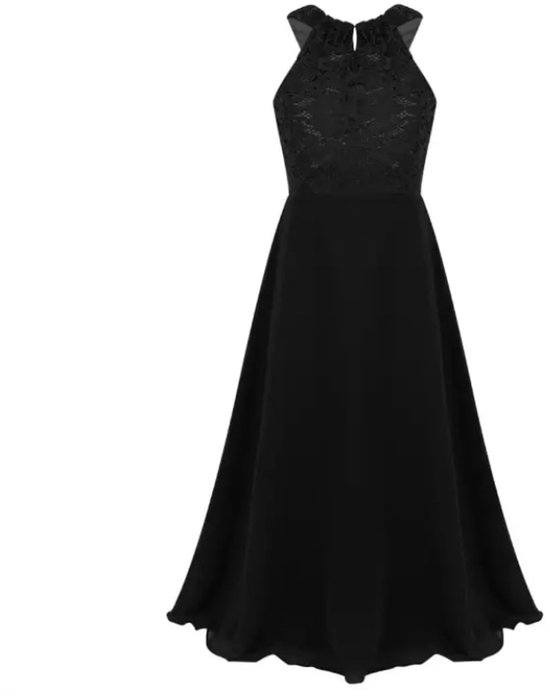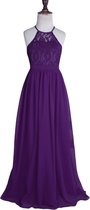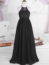 Une belle robe de bal longue avec un corsage en kanten et une jupe longue et souple en mousseline avec jupon. Modèle licou Mouwloos avec dos ouvert et fermeture éclair dans la partie jupe. La jupe a une forme légèrement évasée.