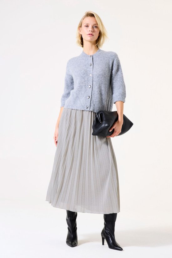 Jupe plissée élégante à taille haute. Cette jupe a une taille élastiquée et une coupe régulière, la rendant confortable et élégante. Cet article est composé à 68% de polyamide et à 32 % de fil métallique, ce qui lui confère un aspect luxueux et une belle brillance.