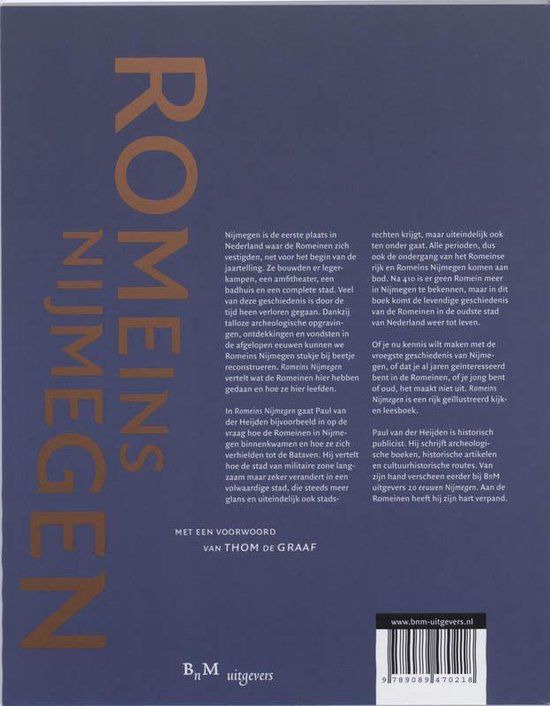 Nijmegen is de eerste plaats in Nederland waar de Romeinen zich vestigden, net voor het begin van de jaartelling. Ze bouwden er legerkampen, een amfitheater, een badhuis en een complete stad. Veel van deze geschiedenis is door de tijd heen verloren gegaan. Dankzij talloze archeologische opgravingen, ontdekkingen en vondsten in de afgelopen eeuwen kunnen we Romeins Nijmegen stukje bij beetje reconstrueren. Romeins Nijmegen vertelt wat de Romeinen hier hebben gedaan en hoe ze hier leefden.