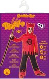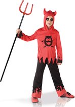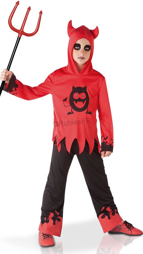 Costume de diable aux yeux mobiles pour garçon - Ce costume de diable se compose d'un haut et d'un pantalon. (Trident et chaussures non inclus.) Le haut a des manches longues et une capuche avec des cornes de diable. Un motif de flamme noire est présent aux extrémités des manches et un diable noir avec des yeux mobiles peut être trouvé sur le devant. Le bas se termine par des points. Le pantalon est noir et a une taille élastique. Des flammes rouges se trouvent au bas des tuyaux. Cette tenue diable sera parfaite et originale pour Halloween! "
