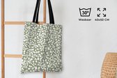 Le sac est en tissu polyester avec une structure en coton. Le sac de transport a deux anses en coton. De plus, le sac à main est lavable à 30 degrés. Le sac est également léger et pliable, vous pouvez donc toujours l'avoir avec vous. Vous voulez vraiment ce client !