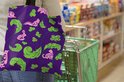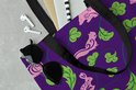 Motif d'animaux roses et de feuilles vertes sur fond violet.