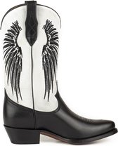 Les bottes de cowboy noires ont des coutures western traditionnelles, un bout pointu et un talon bloc de 4 cm de haut. La hauteur de la tige est de 25 cm et la circonférence de la tige est de 38 cm. L'extérieur est en cuir. Utilisez les bons produits d'entretien comme Collonil clean & care 200ml.