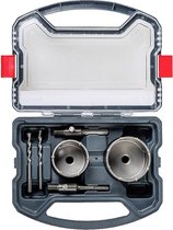 Aménagement intérieur, travaux d'électricien et d'installation, pose de comptoirs et de plans de travail de cuisine, menuiserie. Diamètre 20…83 mm, profondeur de coupe 38 mm, denture HSS Vario, foret pilote HSS 6 mm, queue hexagonale intégrée, résistant à la chaleur, concentricité précise, pas de coincement, pas de brûlure des bords de la pièce, évacuation sans problème des copeaux. Pour l'acier (de construction), l'acier brut gris, l'aluminium, le bronze, le cuivre, le plastique, l'acrylique, les plaques de plâtre, le bois, le GRP, les panneaux isolants en fibre de bois, le vinyle, les panneaux stratifiés (HPL).