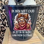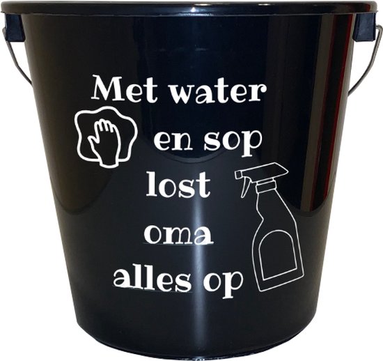 Seau avec texte : grand-mère résout tout avec de l'eau et du savon