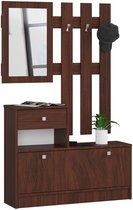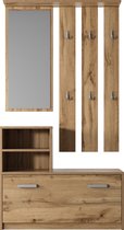 Six cintres sont placés sur un panneau simple et de bon goût, surmonté d'une étagère pratique sur laquelle vous pouvez accrocher des vestes, des manteaux et des parapluies. L'ensemble Yesfir comprend de l'espace pour une armoire à chaussures fonctionnelle pouvant accueillir environ 8 paires dans deux compartiments. Le placard dispose d'étagères pour les petits objets tels que les chapeaux, les gants ou la correspondance. L'ensemble est complété par un grand miroir à la surface cristalline.