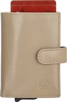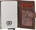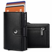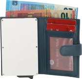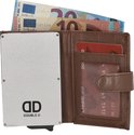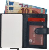 Le support en aluminium offre de la place pour 6 à 7 cartes ou cartes de fidélité. Le boîtier en cuir offre également de la place pour 2 cartes, billets et pièces de monnaie dans la poche zippée spéciale à l'extérieur. Le portefeuille se ferme facilement grâce à la languette à bouton-poussoir.