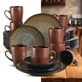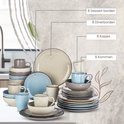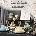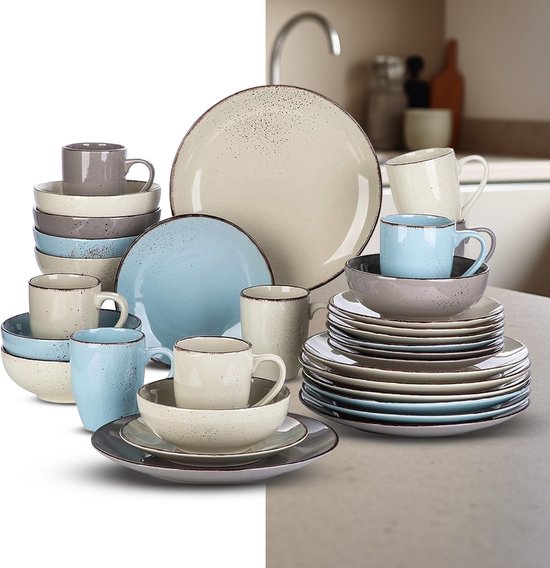 - Set de 32 pièces : Comprend 8 assiettes plates, 8 assiettes à dessert, 8 bols de 800 ml et 8 tasses.