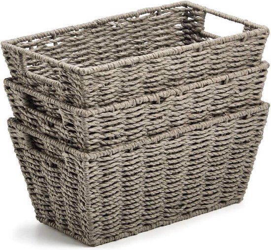 Cet ensemble de 3 paniers de rangement robustes est idéal pour organiser vos affaires avec style. Le design rectangulaire dans une couleur gris neutre et chaud s'adapte parfaitement à n'importe quelle pièce ou chambre d'enfant. Les paniers sont fabriqués à partir de corde de papier torsadée résistante tissée autour d'un cadre métallique robuste dans un design de panier moderne. Les avantages de ces paniers incluent la capacité peu encombrante de les empiler facilement lorsqu'ils ne sont pas utilisés. Cela les rend faciles à ranger dans un placard ou un espace de stockage. De plus, les 2 poignées enfichables intégrées rendent le transport des paniers sûr et facile. Ces paniers polyvalents peuvent être utilisés pour ranger des cosmétiques, des appareils de cuisine, des speelgoed, des vêtements, des outils, des articles essentiels de salle de bain et bien plus encore. La construction compacte garantit que les paniers ne prennent pas trop de place dans votre pièce. Spécifications : - Set de 3 paniers - Dimensions (chacun) : 30 x 17,5 x 14 cm - Capacité de stockage : 3L L - Matériau : corde en papier, cadre en métalAjouter Ajoutez ces paniers de rangement élégants et pratiques à votre salon, chambre d'enfant, salle de bain, chambre ou ailleurs dans la maison pour un espace bien rangé et organisé.