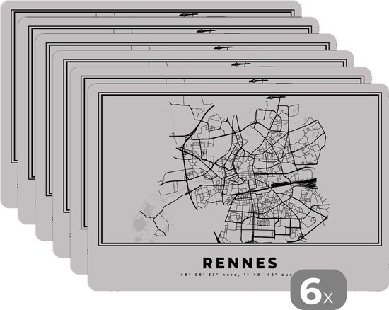 Set de table - Napperons plastique - Rennes - Carte - Plan de la ville - Wit Zwart - Carte - 45x30 cm - 6 pièces - Résistant à la chaleur - Antidérapant - Sous-couche - Amovible
