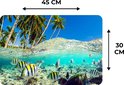 Plage tropicale avec un banc de poissons de différentes couleurs. Les animaux ont un motif rayé.Spécifications produit