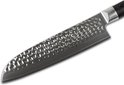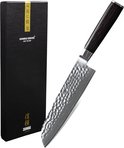 Le Damassé martelé BRDamas Nakiri parShinrai Japon contient 67 couches d'acier damassé élégant, durci à 61 HRC Rockwell. Le bord est tranchant comme un rasoir et peut également être parfaitement affûté. Ce couteau convient pour couper des légumes très petits et pour les éplucher finement. La pointe du couteau est légèrement arrondie pour vous permettre de couper rapidement vos légumes en biais.
