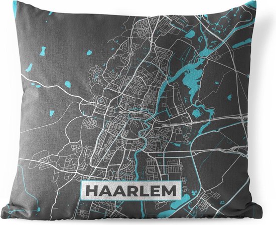 Sierkussen d'extérieur - Carte - Haarlem - Grijs - Blauw - 60x60 cm - Résistant aux intempéries