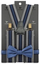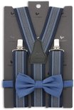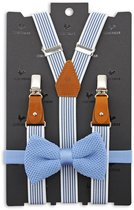 Cette combinaison bleue de bretelles rayées dans les couleurs bleu et blanc avec un nœud papillon bleu foncé est un incontournable dans votre garde-robe. Juste pendant les jours ouvrables mais aussi certainement à porter lors d'une fête, un look décontracté en bleu foncé est toujours possible. Cela donne un peu plus de style à votre outfit . Vous pouvez commander ce pack combiné directement en ligne.