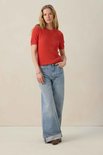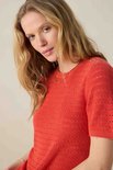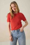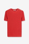 Pull en tricot rouge avec boutons dorés de Sissy-Boy. Le haut en tricot a une encolure ronde, des manches courtes et une coupe régulière. De plus, il a une couleur rouge avec une structure sur toute la surface du tricot. Le mannequin mesure 1,77 m et porte une taille S Matière : 62 % viscose, 37 % coton, 1 % polyamide