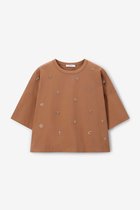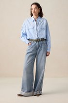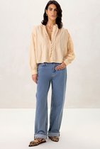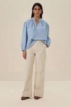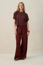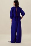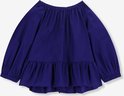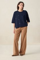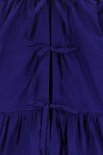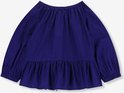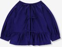 Haut bleu foncé à volants de Sissy-Boy. Le haut a des manches bouffantes, un volant dans le bas et se ferme par des nœuds dans le dos. Le mannequin mesure 1,77 m et porte une taille S Matière : 100 % coton.