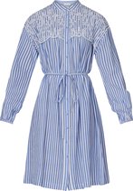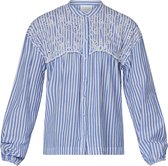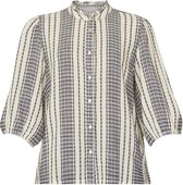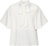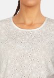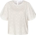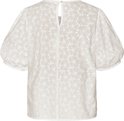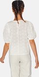 Il s'agit d'un haut en coton uni avec un motif troué. Le haut a une encolure ronde et des manches mi-longues bouffantes.