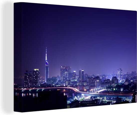 Skyline nocturne de la ville japonaise de Fukuoka Toile 90x60 cm - Tirage photo sur toile (Décoration murale salon / chambre) / Villes asiatiques Peintures sur toile